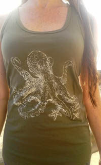 Octopus is available for men in maroon, brown, and white eco-smart t-shirts. For women in olive, gray, and white tank tops.