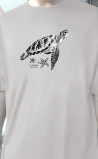 Sea Turtle is available for men in olive, sand, and light blue eco-smart t-shirts. For women in olive and light gray flowy tri-blend tank tops. |
